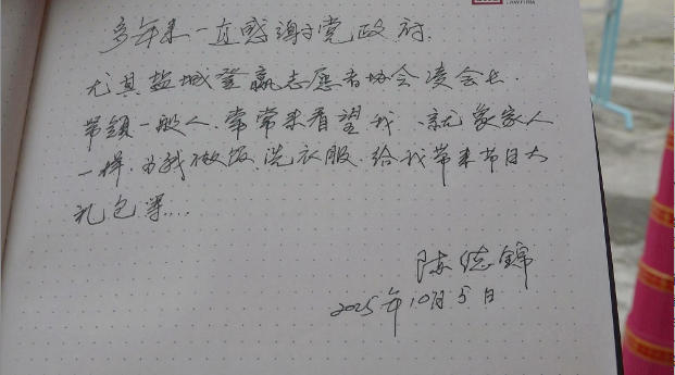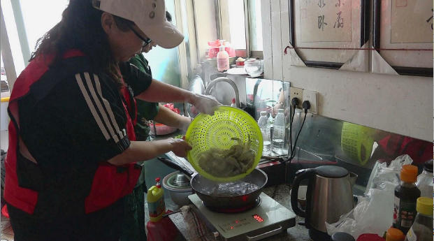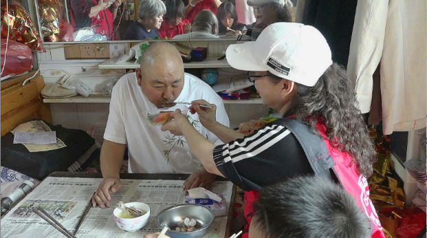 上午10点钟,志愿者一行走进了陈德锦的门市里,除了带来的中秋礼品和菜肴外,还根据陈德锦的需求,给他带了两条大毛巾,以及一件写字用的宣纸。放下手中的东西,志愿者就分头行动,帮助整理门市内的环境,准备烹饪中午的菜肴。据了解,陈德锦患病已经有三十多年了,现在已经无法站立行走,只能瘫坐在床上,有个邻居在照顾他的生活起居,他家有姊妹四个都患有同类疾病,其他三人已先后离世,他现在靠政府的补贴生活,自己又开了一间售卖祭祀用品门市,自己平时也做点手工再挣点零花钱贴补家用。在等待吃饭的过程中,人称“刘大姑”的“中国好人”、盐城市公安局亭湖分局关工委副主任刘婵详细了解了陈德锦的身体状况和家庭情况,勉励他放宽心态,与病魔作斗争。陈德锦告诉笔者,多少年下来,承蒙志愿者的关心和照顾,四时八节都来看看我,真的感谢凌会长她们一帮人,一直把我当着他们的家人。