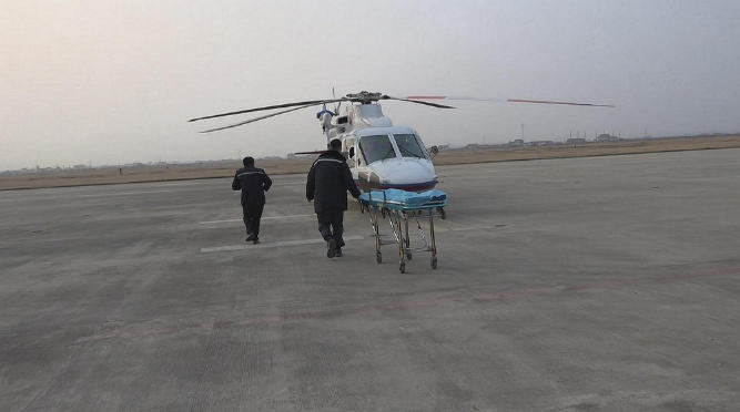 接到求助警情,交通运输部东海救助局迅速启动海上应急救援预案,向空管部门申请飞行航线,协调射阳120急救中心安排救护车到机场等待转运受伤渔民,同时指令派驻在射阳通用机场待命的第一救助飞行队B-7357救助直升机做好起飞救援准备。下午14点50分左右,一切准备就绪的救助直升机从射阳通用机场起飞,快速朝渔船所在海域飞去。到达渔船的上空后,机组人员克服渔船甲板上作业空间狭小、渔船左右晃动幅度大的困难,采用索降的方式将救生员下放到渔船甲板上,经过救生员对受伤渔民的伤情进行现场评估后,随即采用双人双挂的方式,将受伤渔民转移进直升机机舱内。下午16点55分,救助直升机在地面引导员的引导下,平稳降落在射阳通用机场的五号停机坪上,早已等候在机场的120救护车上的医护人员快速将受伤渔民转运上救护车,送到医院救治。据受伤渔民自己讲,他自己在捕捞作业过程中,一个不留神,左脚被一个滚筒绞伤,导致脚踝处骨折。