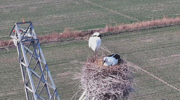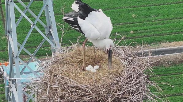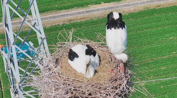 拍摄者宋婧告诉记者,2月13日中午,她利用中午的休息时间,出来用无人机拍摄麦子的生长状况时,发现五分场境内的一座高压线铁塔上,有大鸟正忙着在搭建鸟巢,便立即取出随身携带的无人机,在不惊扰到鸟儿的情况下进行了拍摄,结果发现鸟巢里已有两枚蛋,经将拍摄的视频给专业人士辨认,确认这两只大鸟是国家一级保护野生动物东方白鹳。过了几天,宋婧再次过来进行拍摄时,发现鸟巢里出现了四枚鸟蛋。在随后的日子,宋婧利用工作闲暇之余,隔三差五就过来进行拍摄观察。3月17日中午,宋婧携带无人机再次过来拍摄时,发现鸟巢里出现了两只雏鸟和两枚鸟蛋,一只东方白鹳时而卧在鸟蛋上,时而站起来用脚拨动着鸟蛋,而另一只东方白鹳则站在鸟巢的旁边,警惕地注视着周边的环境。