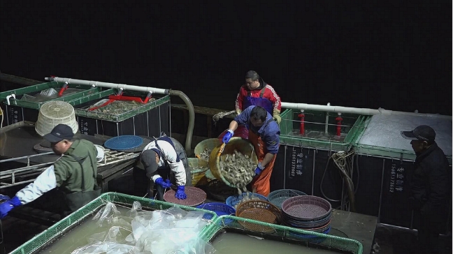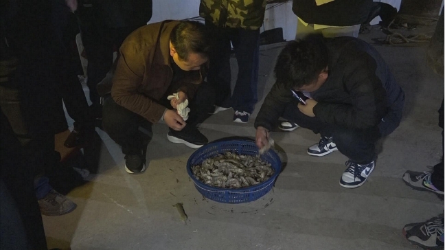 3月26日夜间10点钟左右,在射阳港南侧的三百间十八号码头,一艘渔船刚刚停靠到码头,船上的渔民就忙着用网抄从暂养池里捞起一网皮皮虾,倒进旁边的塑料周转筐内,随即又分装到小的塑料筐内,被搬运上一辆厢式货车内的暂养桶里。几名射阳本地的商贩也随机挑选出两筐,对筐内的皮皮虾进行检查,查看皮皮虾的活力度和肥度,来确定拿多少货。