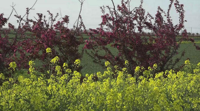 在风光带里,一株株海棠花在树下金黄油菜花的映衬下,已经陆续的绽放,勤劳的蜜蜂在花瓣上翩翩起舞,给烂漫的春天增添了无限的生趣。据了解,江苏农垦临海农场通过与南京林业大学合作,先后引进各类海棠品种100多个,建立高效栽培和景观应用示范基地,构建沿河十里海棠风光带,目前海棠花已经陆续绽放,再过一周左右,海棠花将进入盛开期,花期将持续到四月下旬,是广大游客和摄影爱好者踏春赏花的好去处。