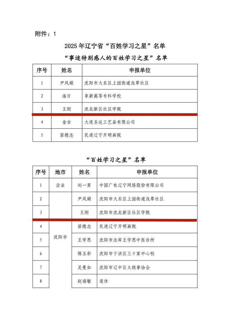辽宁省社区教育指导中心4月14日发布《关于公布2025年辽宁省“百姓学习之星”和“终身学习品牌项目”名单的通知》,其中,沈阳市沈北新区社区学院兼职报告员王刚老师被评为2025年辽宁省“事迹特别突出的百姓学习之星”和辽宁省“百姓学习之星”。这是王刚老师继获得全国2025年新时代“百姓学习之星”之后的又一殊荣。在此感谢王刚老师的辛勤付出,感谢省市有关部门的大力推荐!