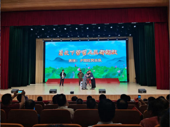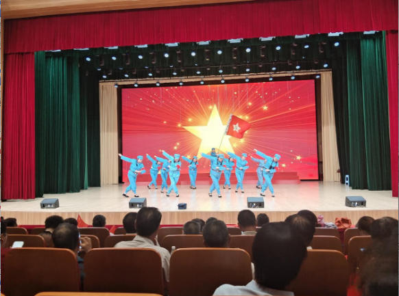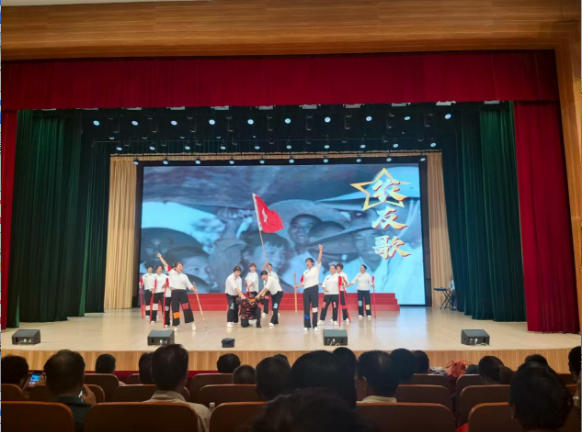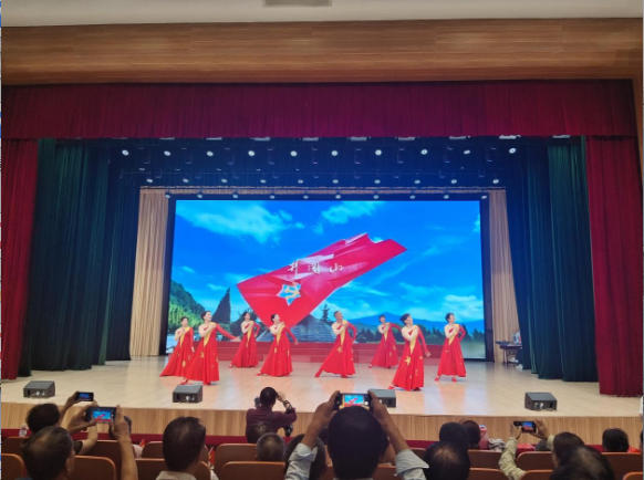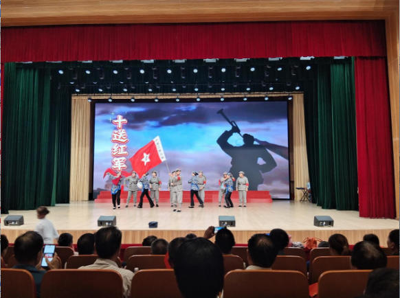 演出现场,节目形式丰富多元,内容紧扣主题,每一幕都浸润着红色情怀。群舞《亲吻祖国》以灵动舞姿拉开汇演序幕,舞者们用肢体语言勾勒出对祖国的深沉眷恋;歌舞《映山红》《十送红军》凭借悠扬旋律与真挚演绎,迅速将观众带回那段战火纷飞却信念如磐的岁月,让红色记忆在旋律中缓缓流淌。