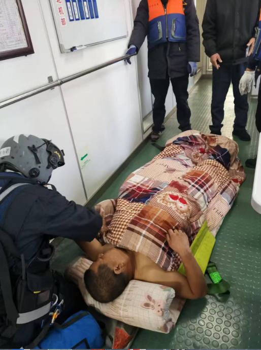 10月25日凌晨,盐城海上搜救中心接到江苏省水上搜救中心转警:在距离射阳港东偏北方向约90海里的海面上,一艘浙江籍渔船上,有一渔民在捕捞作业时被渔网缠绕拖入海中,该渔民被救起时,渔网嵌入大腿,受伤严重,意识模糊,急需救助。