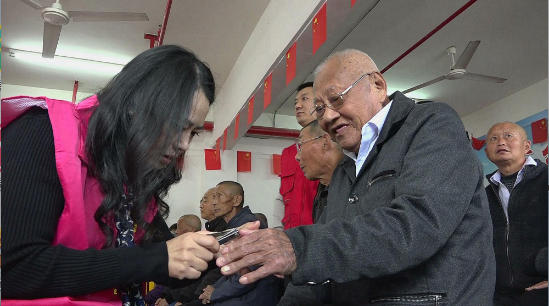 一走进盘湾敬老院,志愿者就忙着将车上装载的重阳糕、香蕉、美味饼干,以及志愿者张金斌个人捐赠的近百斤猪肉和志愿者李明红捐赠的精美菜肴。在敬老院的一间会议室里,老人们早就坐在那里等待志愿者过来了,小朋友志愿者忙着给老人送香蕉、橘子和瓜子,而其他志愿者则忙着帮老人修剪指甲,会理发的志愿者李功勤则忙着给老人理发。慰问活动在一曲《绣红旗》的曲目中拉开了序幕,志愿者给老人们表演了舞蹈、淮剧等喜欢的节目,而志愿者郭永清演唱的歌曲联唱更是将活动推向了高潮,志愿者精彩的表演,赢得了老人们的阵阵掌声。演出活动结束后,老人们还在志愿者的指导下,玩起了套圈游戏,拿着套中的小礼品,老人们露出了开心的笑容。